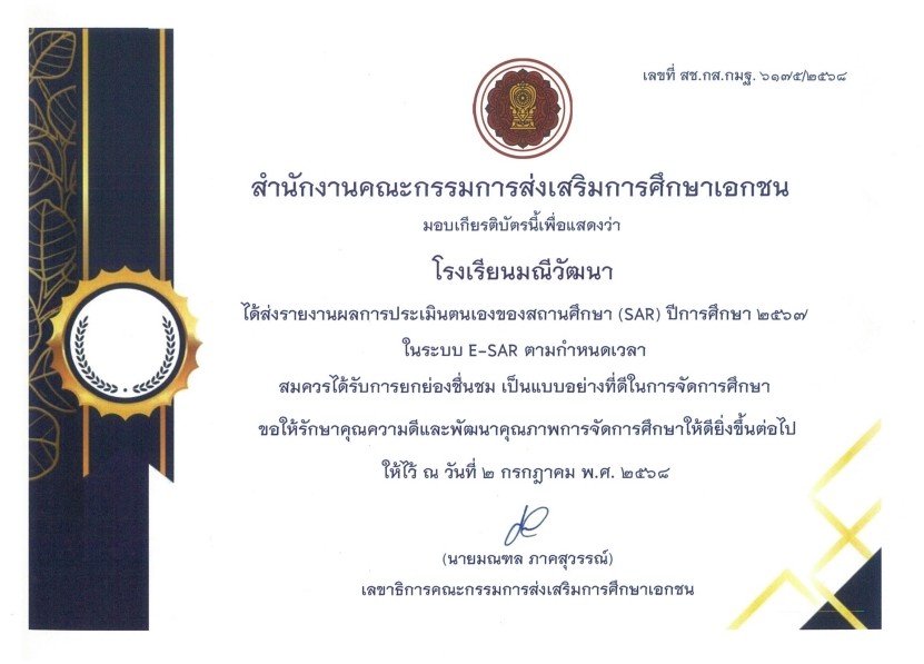 หน้าหลัก รอบรั้วมณีวัฒนา เกียรติบัตรการดำเนินงานระบบสารสนเทศด้านการประกันคุณภาพการศึกษา (E-SAR) ปีการศึกษา 2567