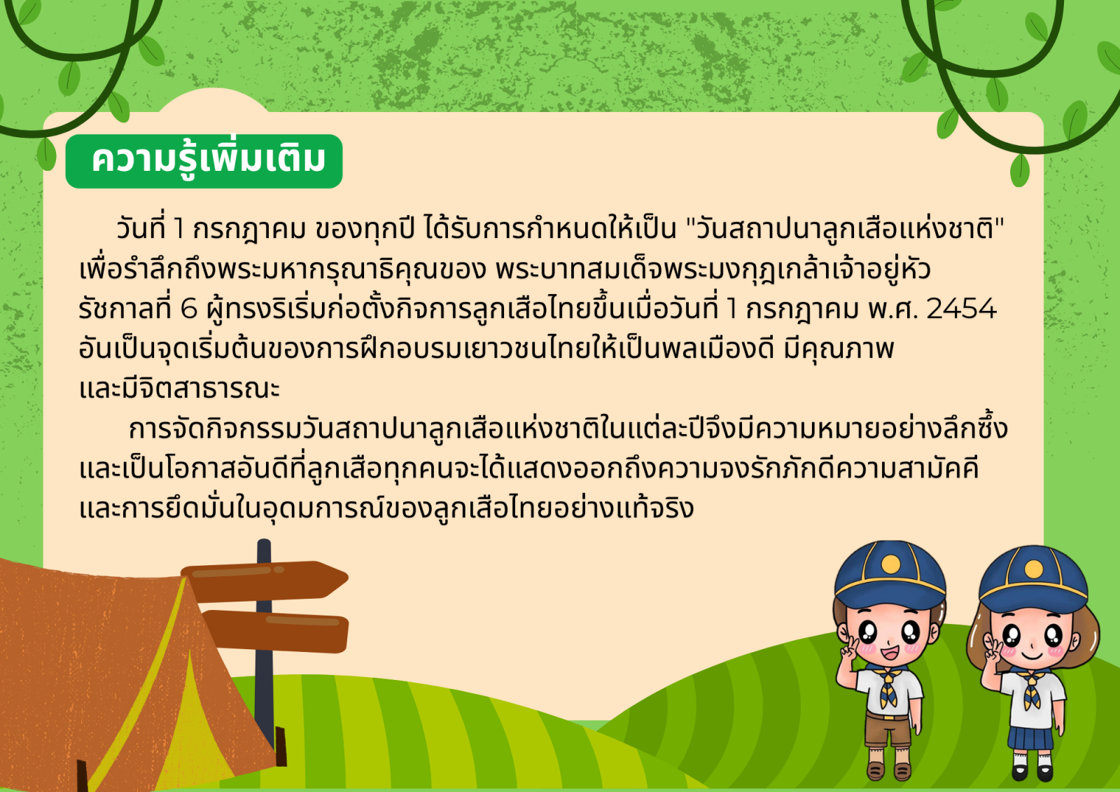 วันที่ 1 กรกฎาคม ปีการศึกษา 2568 วันสถาปนาลูกเสือแห่งชาติ นักเรียนชั้นประถมศึกษาปีที่ 1 - 6