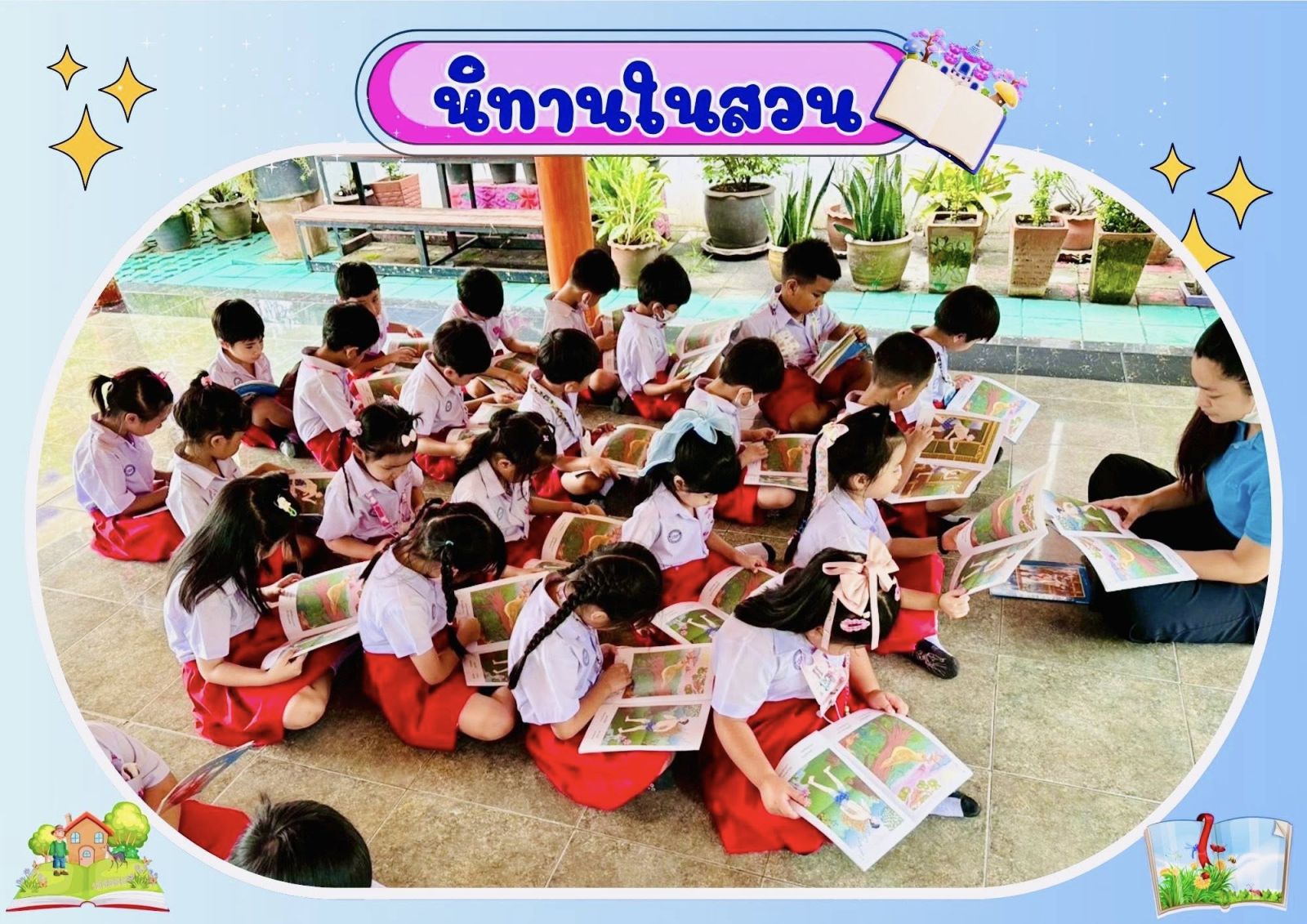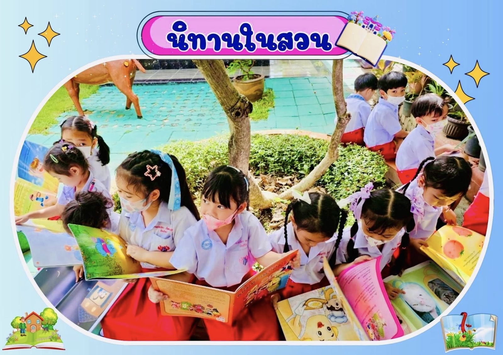โดยเลือกอ่านนิทานเรื่องที่ชอบในมุมต่าง ๆ ของโรงเรียน